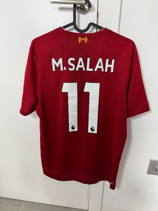 Camiseta de fútbol del Liverpool con el número 11 y el nombre de Salah. - Diseño deportivo. - Escudo del equipo en la parte superior.