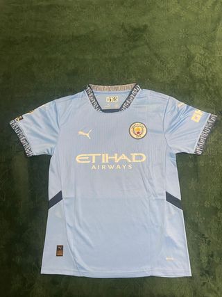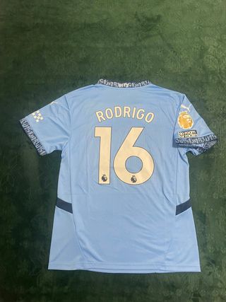 Camiseta de fútbol Man City con el dorsal 16 de Rodrigo. - Color azul característico del equipo. - Detalles del patrocinador Premier League en el dorsal.