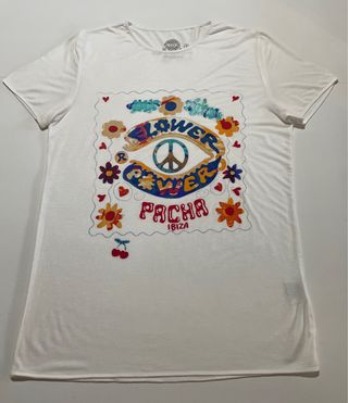 Camiseta blanca con un llamativo estampado Flower Power de Pacha Ibiza. - Diseño frontal con ojo psicodélico y símbolo de la paz. - Detalles de flores y cerezas. - Estilo retro y vibrante.