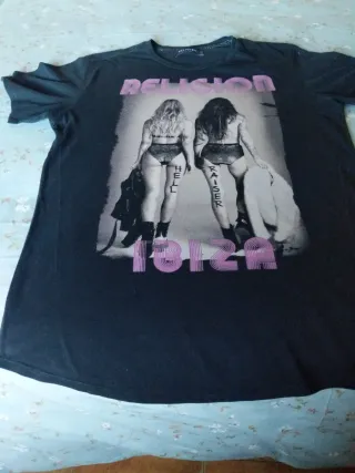 Camiseta negra de manga corta con estampado. - Estampado frontal con dos mujeres y texto. - Detalle de texto RELIGION en la parte superior. - Detalle de texto IBIZA en la parte inferior del estampado.