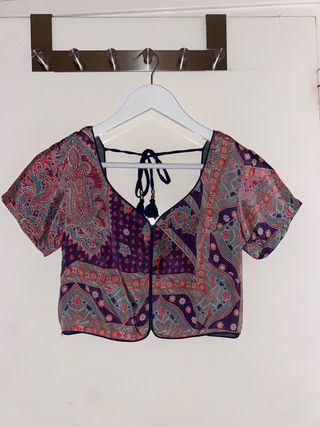 Camiseta de manga corta con estampado descolorido que compré en un mercadillo hippy de Ibiza hace años. No lleba etiqueta y estaba hecha a mano. Me la puse 2 veces. Es talla S de mujer. Se ve de buena calidad el tejido y el estampado de duende.