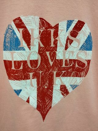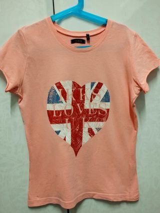Camiseta Ikks rosa con un corazón con la bandera de UK y mensaje. Talla S, aunque también sirve para niñas (11-16 años) y talla XS. Buen estado. Hago envíos y entrega en mano.