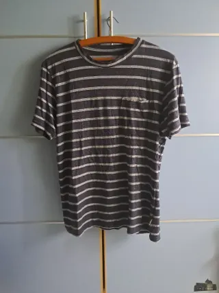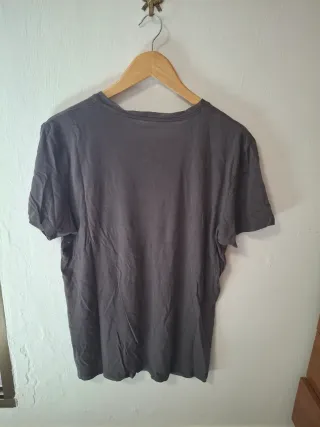 Camiseta de manga corta con cuello redondo y bolsillo en el pecho. - Tejido suave y ligero. - Acabado desgastado. - Detalle de logo en el bajo. - Tiene un par de picadas que se aprecian en las ultimas fotos.