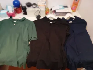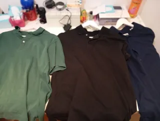 Se vende lote de tres polos de las marcas Uniqlo y Jack & Jones, todos en talla L. - Un polo verde Uniqlo. - Un polo negro Uniqlo. - Una camisa azul Jack & Jones.