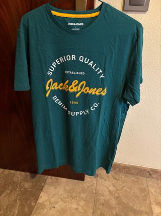 Vendo camiseta de la marca Jack Jones. Es de color verde y tiene un diseño estampado en la parte delantera y trasera. - Talla: (Añadir talla) - Material: Algodón (o especificar si se conoce) - Estado: Usada, en buen estado (o especificar el estado) - Se entrega tal cual se ve en las fotos.