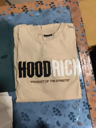 Conjunto de cuatro camisetas. - Camiseta beige con estampado floral y texto ARIZONA. - Camiseta verde con logo pequeño. - Camiseta beige con texto HOODRICH y PRODUCT OF THE STREETS. - Camiseta blanca lisa.