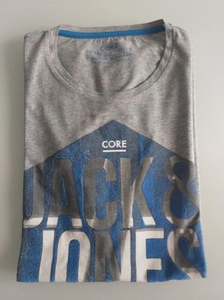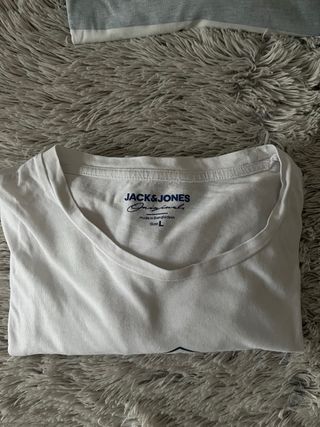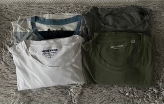 Lote de cuatro camisetas de manga corta de la marca Jack & Jones. Son prendas versátiles y cómodas. Vendo 4 camisetas de hombre, usadas muy poco y en perfecto estado. 🔹Camiseta de rayas grises y blancas con cuello azul. 🔹Camiseta blanca con logo. 🔹Camiseta gris con estampado. 🔹Camiseta verde oliva lisa. 🔹 Estado: muy cuidadas, sin manchas ni roturas 🔹 Motivo de venta: no les doy uso 💥 Precio pack 4 camisetas: 40€ 💥 Precio por unidad: 8€