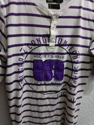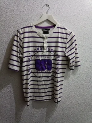 Camiseta de manga corta con estampado de rayas moradas y blancas. Presenta un diseño con cuello Henley y un parche gráfico en el pecho. Talla S pero es como una M - Diseño de rayas moradas y blancas. - Cuello Henley con botones. - Parche gráfico en el pecho.