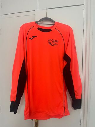 Camiseta de manga larga para portero. - Diseño en color naranja vibrante con detalles en negro. - Cuello redondo y puños elásticos. - Logo de la marca Joma en el pecho.