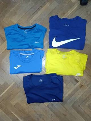 Pack de 5 camisetas deportivas para hombre. - Camiseta L - RUNNING azul con logo Nike. EN BUEN ESTADO - Camiseta L - azul claro con logo Joma. COMO NUEVO - Camiseta XL - amarilla con logo Nike. NUEVO - Camiseta XL - RUNNING azul OSCURO con logo Nike. EN BUEN ESTADO - Camiseta azul XL - con logo grande Nike. EN BUEN ESTADO