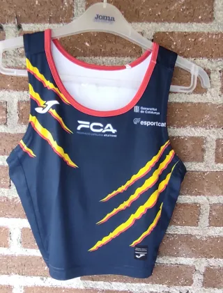 Top deportivo para mujer de la marca Joma, ideal para la práctica de atletismo. Diseño moderno y cómodo. - Color principal azul con detalles en rojo y amarillo. - Escudo de la Federació Catalana d'Atletisme. - Logo de Generalitat de Catalunya y esportcat.