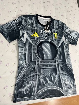 Camiseta de entrenamiento Adidas Juventus para la temporada 2025/2026, con un diseño inspirado en el arte clásico. - Diseño artístico detallado. - Logo de Adidas y escudo de Juventus. - Cuello redondo y mangas cortas. Tengo tambien la talla S