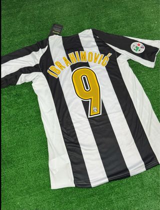 Camiseta de fútbol de la Juventus con el dorsal número 9 y el nombre de Ibrahimovic. - Diseño de rayas blancas y negras. - Escudo del equipo en la manga.