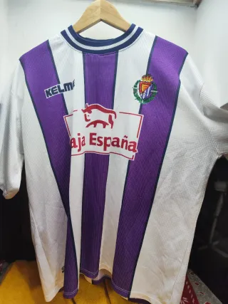 Camiseta de fútbol del Real Valladolid de la temporada 1999-2000, marca Kelme, talla XL. Usada con desgaste normal. Sin manchas que yo sepa. Analizar fotos. - Diseño a rayas verticales moradas y blancas. - Logo de Kelme en la manga. - Escudo del club bordado. - Patrocinador Caja España en el frontal. - Grabado de Chema 14 en el reverso.