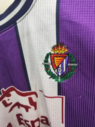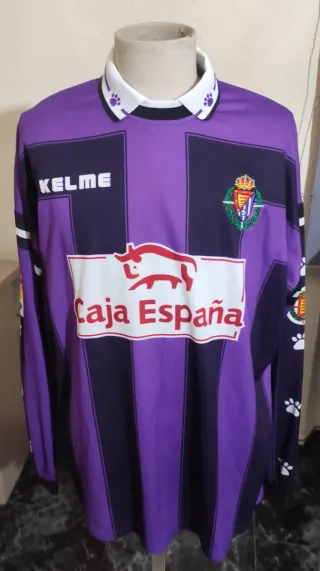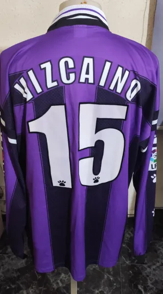 Camiseta matchworn del Real Valladolid de la temporada 1997, camiseta utilizada por vizcaíno, cualquier duda o fotos que necesites dímelo sin compromiso. Se escuchan ofertas serias! - Diseño a rayas moradas y oscuras. - Cuello blanco con detalles. - Logo de Kelme en el pecho. - Patrocinador 'Caja España' en el frontal.