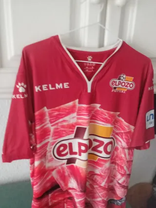 Camiseta de fútbol sala del El Pozo Murcia, marca Kelme. Diseño llamativo con estampado de jamón. - Cuello redondo. - Manga corta. - Logo de Kelme en las mangas y pecho. - Logo de El Pozo Futsal en el pecho.