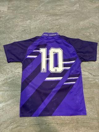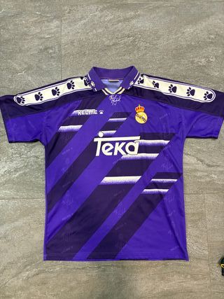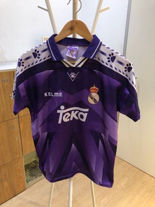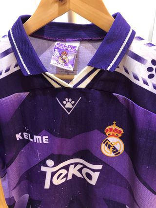 Camiseta de fútbol original del Real Madrid. Temporada 96/97. Original. - Diseño clásico con detalles en morado. - Logo de Kelme bordado en el pecho. - Escudo del Real Madrid con corona.