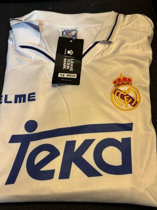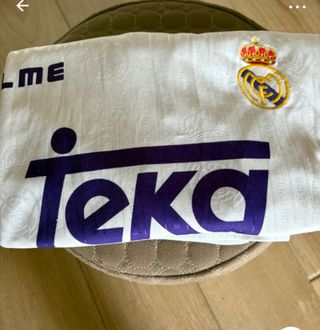 Camiseta de fútbol del Real Madrid. - Diseño clásico en blanco con detalles en azul. - Logo de Kelme en la manga. - Patrocinador Teka en el frontal. - Escudo del club con la corona. Preferiblemente entrega en mano o por correo certificado