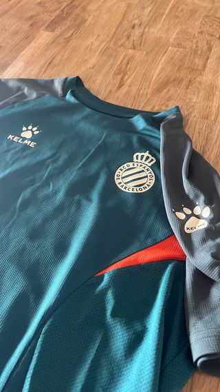 Camiseta deportiva del R.C.D. Espanyol. - Diseño con detalles en naranja y mangas grises. - Logo de Kelme bordado en el pecho. - Escudo del club en el pecho.