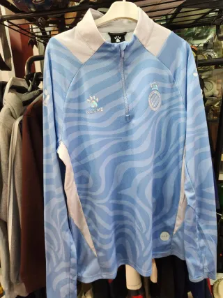 Camiseta deportiva del RCD Espanyol. - Diseño con estampado de ondas en tonos azules y blancos. - Cuello alto con media cremallera. - Logo de Kelme bordado en el pecho. - Escudo del RCD Espanyol bordado en el pecho.