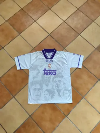 Camiseta de fútbol del Real Madrid de la temporada 1996-1997. - Diseño clásico en blanco con detalles morados. - Logo de Kelme en el pecho. - Escudo del Real Madrid bordado. - Patrocinador Teka en grande.