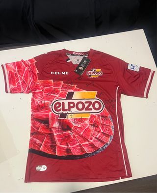 Camiseta oficial del club de fútbol sala ElPozo, firmada por el equipo. - Diseño con estampado de jamón. - Logo de ElPozo Futsal. - Marca Kelme. - Sin estrenar con etiqueta
