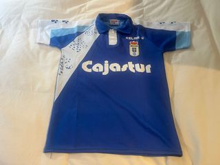 Camiseta de fútbol del Real Oviedo de la temporada 1993/1994. - Diseño clásico con el escudo del club. - Detalles en blanco y azul claro en las mangas. - Logo de Kelme en el pecho. En buen estado de conservación. Talla equivalente a 12/14 de niño. PRODUCTO OFICIAL