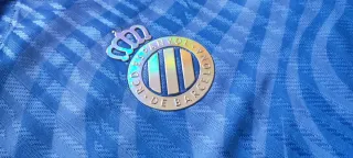 Camiseta de fútbol del RCD Espanyol. - Diseño a rayas verticales azules y blancas. - Logo del club en el pecho. - Manga corta.