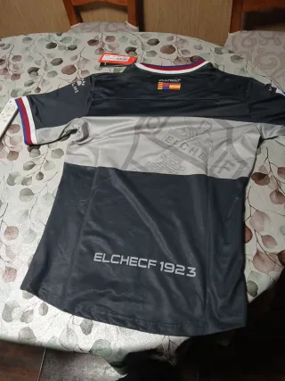 Camiseta de fútbol del Elche Club de Fútbol. - Diseño con detalles en gris y blanco. - Escudo del equipo en la parte frontal. - Logo de Kelme visible.
