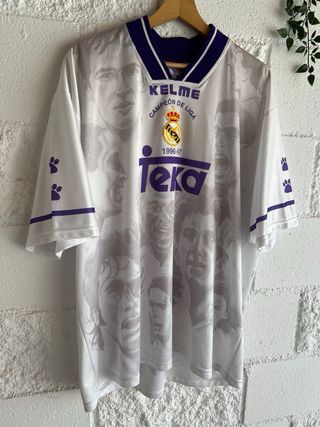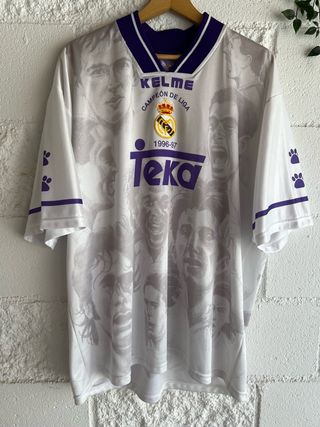 Preciosa camiseta de fútbol Kelme del Real Madrid de la temporada 1996-97. Edición especial Campeón de liga Talla XL. En buen estado