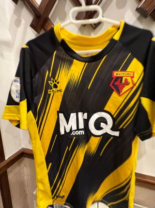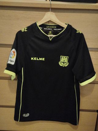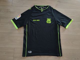 Camiseta original de fútbol de la Agrupación Deportiva Alcorcón de la marca Kelme. Es la segunda equipación negra con detalles amarillos sin publicidad, utilizada en la temporada 2017 - 2018 cuando estaba en segunda división. Está en muy buen estado, como se ve en las fotos. Talla M. - Talla: No especificada en la imagen. - Diseño: Negro con detalles amarillos.