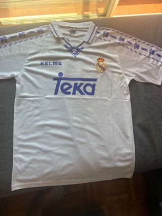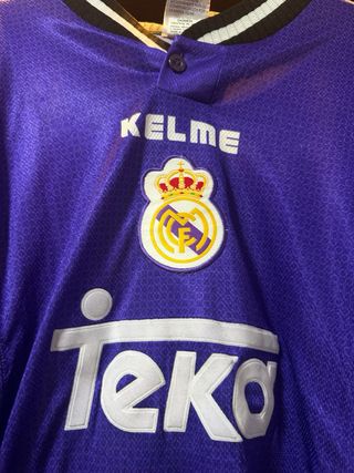 Camiseta de fútbol del Real Madrid de la temporada 1994-1996, esta perfectamente conservada, sin manchas ni imperfecciones. - Prenda vintage - Diseño clásico con el patrocinador Teka. - Logo de Kelme en el pecho. - Detalles morados y blancos en los laterales y mangas.