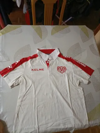 Polo oficial del Rayo Vallecano, marca Kelme. - Diseño en blanco con detalles en rojo. - Escudo del equipo bordado en el pecho. - Cuello tipo polo con botones.