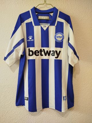Camiseta de fútbol del Deportivo Alavés. - Diseño con franjas verticales blancas y azules. - Logo de Kelme en el pecho. - Patrocinador betway en el frontal.
