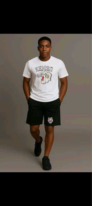 Conjunto de camiseta y pantalón corto de la marca Kenzo. - Camiseta blanca con estampado de tigre. - Pantalón corto negro con detalle de tigre.