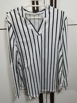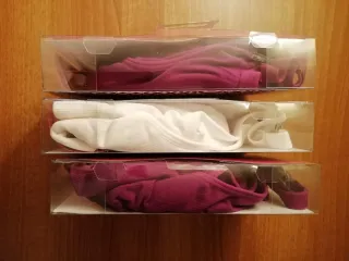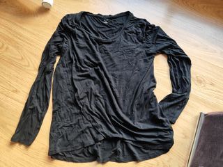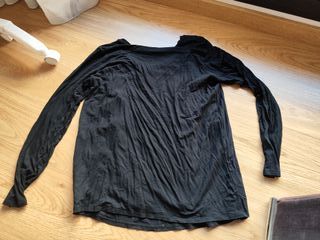 Conjunto de tres camisetas de manga larga. Tienen signos de desgaste, sobretodo la blanca y la azul. Las metí en la secadora y no debía haberlo hecho. La azul queda holgada. La blanca es ideal si tienes bastante pecho. La negra es tipo camiseta, no queda muy larga, por la cadera. Yo mido 1,62 y peso 55kg