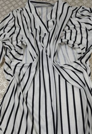 Camiseta de lactancia con un diseño de rayas blancas y negras. Es cómoda y práctica. - Diseño cruzado frontal. - Mangas cortas.