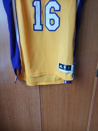 Camiseta de baloncesto de los Lakers, talla L, con el número 16 de Pau Gasol. - Diseño clásico en amarillo y morado. - Logo de Adidas en el pecho. - Logo de la NBA en el pecho.