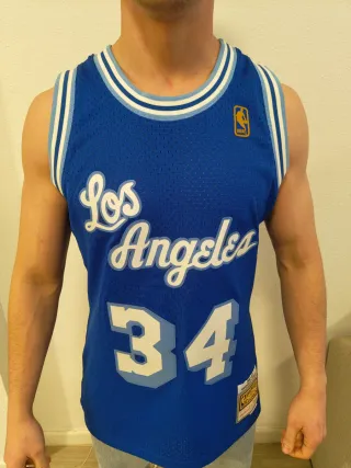 Camiseta de baloncesto de los Lakers de Los Ángeles. - Diseño clásico de Shaquille O'Neal. - Número 34 en la parte delantera. - Logo de Mitchell & Ness en la parte inferior.