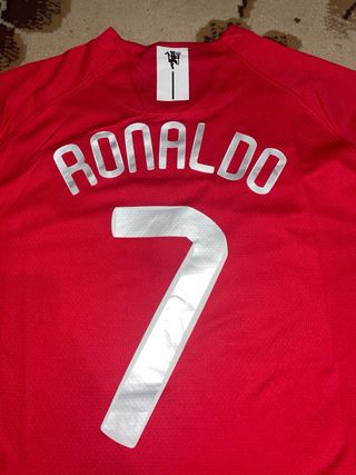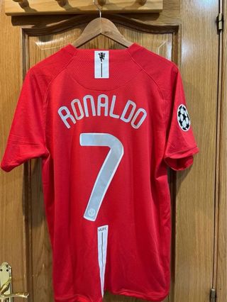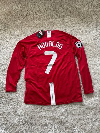 Camiseta de fútbol del Manchester United con el dorsal de Cristiano Ronaldo. Talla L y M - Diseño de manga larga. - Incluye el número 7 y el nombre 'RONALDO' en la espalda. - Parche de la Champions League en la manga derecha. - Logo de Nike en el pecho.