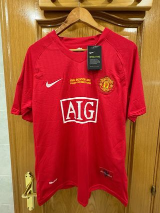 Camiseta de fútbol del Manchester United, edición especial de la final de Moscú 2008. - Diseño conmemorativo de la final de la Champions League. - Logo de Nike y escudo del club. - Patrocinio AIG.