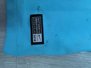 Camiseta de fútbol del Manchester City de la temporada 2013-2014, dorsal 9 del jugador Negredo. - Foto 8, pequeña mancha amarilla en el bajo - Diseño con franjas verticales en azul y blanco. - Tercera equipacion - Escudo del club en el pecho. - Logo de Nike y Etihad Airways impresos.