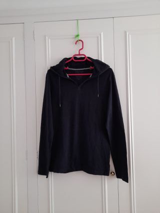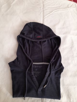 Vendo camiseta de Esprit con capucha con cordones ajustables, en color azul marino de manga larga, cuello en V, 100% algodón. Talla M, medidas: largo 70cm, ancho espalda 40cm, largo mangas 69cm. En perfecto estado.