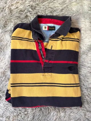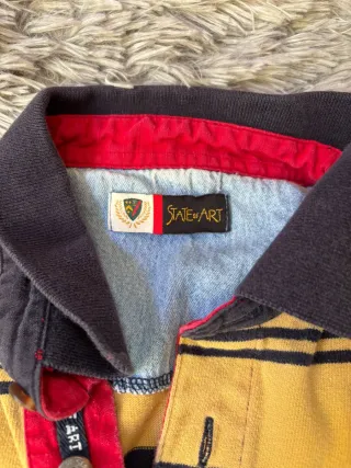 Polo de manga larga de la marca State of Art con un diseño de rayas clásico. - Cuello tipo polo con botones. - Tejido de algodón. - Rayas horizontales en azul marino, amarillo y detalles en rojo. Muy buena marca. Polo poco común.