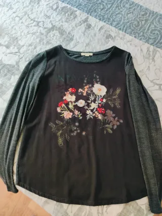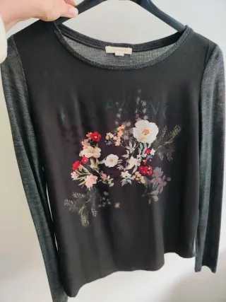 Camiseta de manga larga con un bonito estampado floral en la parte delantera. El frontal es de tela y las mangas y espalda de algodón.