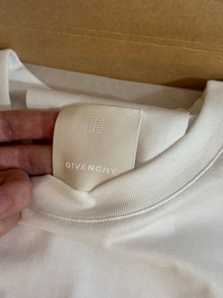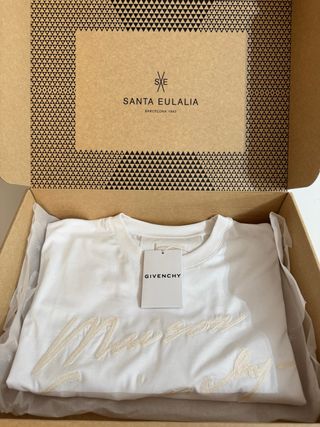 Camiseta de algodón de manga corta con bordado de Maison Givenchy Paris en el frontal. La vendo porque no me vale y le quite la etiqueta de la imagen sin ver lo que ponía detrás. La envío con la propia caja que me la mandó Santa Eulalia. Tiene todas las etiquetas y evidentemente esta intacta. MEDIDAS Ancho (pecho) 60cm Largo total 70cm Hombros 55cm Manga 22cm Cuello 18cm