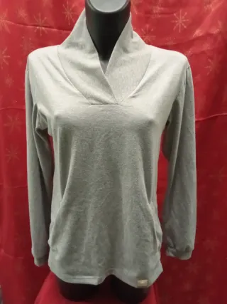 Camiseta de algodón con rayas para mujer. Presenta un diseño clásico y cómodo. - Manga larga. - Bolsillo frontal con cremallera. Algodón Muy cómoda Básica Como nueva. Una única puesta. Medidas Hombros 40 CMS Pecho 45 CMS Largo 60 cm Ideal vaqueros