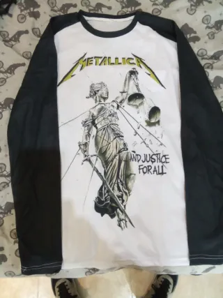 Camiseta de manga larga con el diseño clásico de Metallica. - NO ES DE ALGODÓN, ES POLIÉSTER - Diseño frontal con la icónica imagen de And Justice for All. - Mangas de color negro y cuerpo blanco.