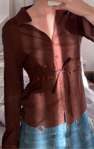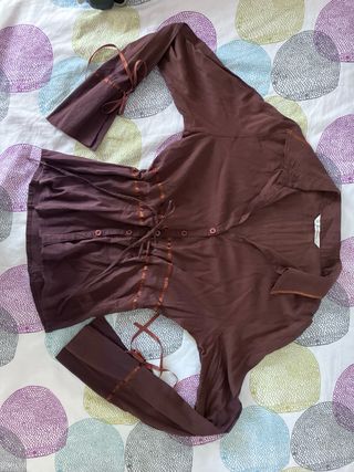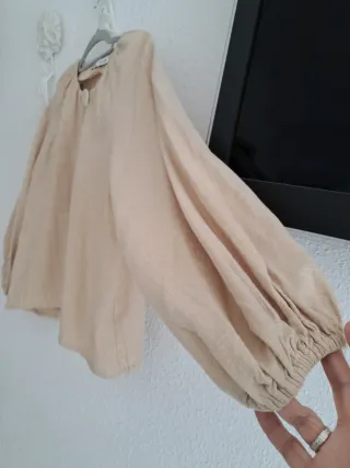 Original blusa de algodón en color crudo, talla S/36/8. Es de manga larga con aberturas en las mangas y un detalle fruncido en la cintura. Se encuentra en muy buen estado. - Acabados delicados - Tejido suave - Diseño elegante - Un único uso. Medidas: Largo 50cm Largo de manga 64cm Ancho de sisa a sisa 49cm Ancho de cadera extensible de 27 a 51cm. Hago envío, también se puede recoger en calle Jaime el Conquistador (28045, cerca de los metros Legazpi y Delicias).