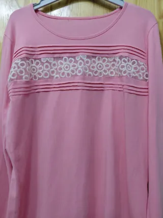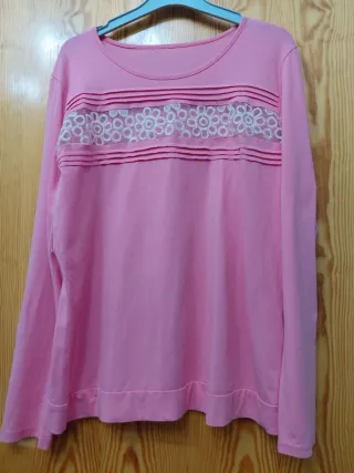 Camiseta de algodón de manga larga en color salmon, con un detalle de encaje floral en la parte delantera. Medidas de sisa a sisa 51, largo 65. Coml talla XL. Perfecto estado. - Diseño con fruncido en la zona del encaje. - Bajo con acabado curvo.